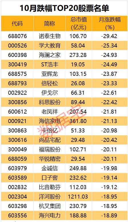 10月份全市场272只个股股价跌幅超过10%,其中诺泰生物、学大教育、海澜家居、海信家电等14只个股单月跌幅超过20%。