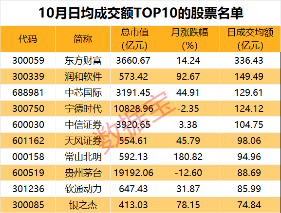 润和软件、中芯国际、宁德时代、中信证券10月日均交易额均突破百亿元。目前券商三季报已全部出炉,50家上市券商中有24家实现净利润同比增长。中原证券指出,在政策强力推动下,四季度行业盈利能力较前三季度有望明显改善。全面换手整合后,随着行业基本面的改善,券商板块有望挑战近年来的高估值。